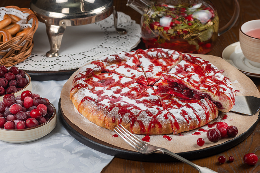 К столу подадим фирменный сладкий пирог, ватрушку с черёмухой, алтайский мед, сушки и, конечно, полезный травяной чай из самовара!